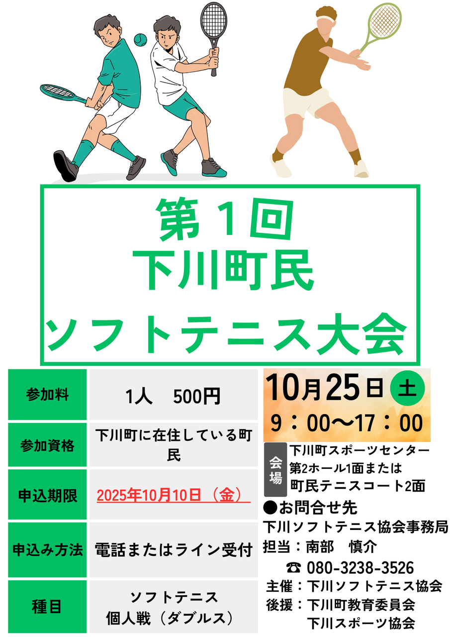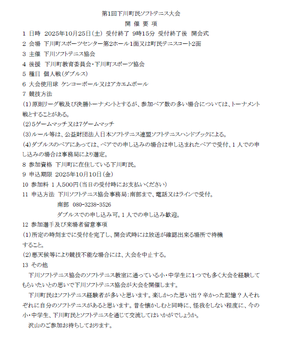 現在位置: トップページ 各課のページ 教育委員会 教育課 第1回下川町民ソフトテニス大会開催のお知らせ 印刷する 第1回下川町民ソフトテニス大会開催のお知らせ 作成日:2025年10月01日最終更新日:2025年10月01日 <教育委員会からのお知らせ> 10月25日(土)に第1回下川町ソフトテニス大会を開催いたします。 皆様のご参加をお待ちしております。 詳細につきましては下記開催要項・ポスターをご覧ください。 このページの作成者・お問い合わせ先 教育委員会電話:01655-4-2511 お問い合わせはこちらから メニュー 各課のページ 各課のページトップ 総務企画課 町民生活課 保健福祉課 産業振興課 農業委員会 教育委員会 教育課 出納室 議会事務局 監査委員事務局 町立下川病院 消防署 特別養護老人ホーム あけぼの園 山びこ学園 下川小学校・下川中学校 下川町議会 行政情報 洪水ハザードマップ リンク集