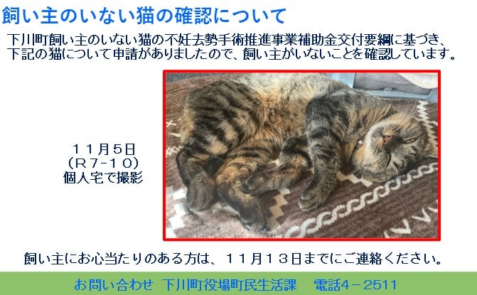 現在位置: トップページ 各課のページ 町民生活課 【11/6~11/13】飼い主のいない猫の不妊去勢手術推進事業に係る飼い主の確認について 印刷する 【11/6~11/13】飼い主のいない猫の不妊去勢手術推進事業に係る飼い主の確認について 作成日:2025年11月06日最終更新日:2025年11月06日 このページの作成者・お問い合わせ先 町民生活課 生活環境係電話:01655-4-2511(内線112・118) お問い合わせはこちらから メニュー 各課のページ 各課のページトップ 総務企画課 町民生活課 保健福祉課 産業振興課 農業委員会 教育委員会 教育課 出納室 議会事務局 監査委員事務局 町立下川病院 消防署 特別養護老人ホーム あけぼの園 山びこ学園 下川小学校・下川中学校 下川町議会 行政情報 洪水ハザードマップ リンク集