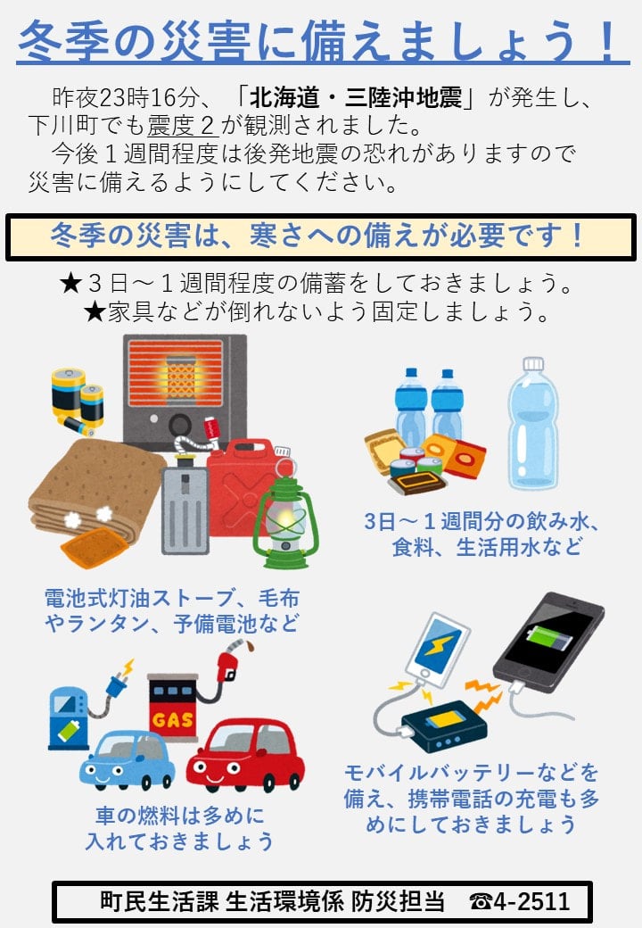 現在位置: トップページ 各課のページ 町民生活課 冬季の災害に備えましょう! 印刷する 冬季の災害に備えましょう! 作成日:2025年12月09日最終更新日:2025年12月09日 このページの作成者・お問い合わせ先 町民生活課 生活環境係電話:01655-4-2511 お問い合わせはこちらから メニュー 各課のページ 各課のページトップ 総務企画課 町民生活課 保健福祉課 産業振興課 農業委員会 教育委員会 教育課 出納室 議会事務局 監査委員事務局 町立下川病院 消防署 特別養護老人ホーム あけぼの園 山びこ学園 下川小学校・下川中学校 下川町議会 行政情報 洪水ハザードマップ リンク集