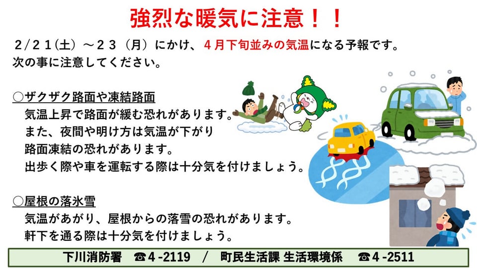 現在位置: トップページ 町民の方へ くらし 生活衛生 【2/21~23】強烈な暖気に注意!! 印刷する 【2/21~23】強烈な暖気に注意!! 作成日:2026年02月20日最終更新日:2026年02月20日 このページの作成者・お問い合わせ先 町民生活課 生活環境係電話:01655-4-2511 お問い合わせはこちらから メニュー 町民の方へ 町民の方へトップ 知恵の環 くらし 健康・福祉・子育て 学び・文化・スポーツ 防災・救急・緊急 下川町議会 行政情報 洪水ハザードマップ リンク集