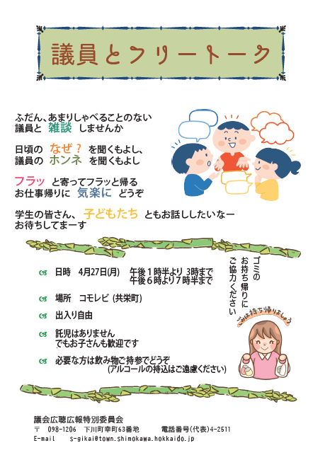 現在位置: トップページ 各課のページ 議会事務局 議員とフリートークを開催します【4月27日(月)】 印刷する 議員とフリートークを開催します【4月27日(月)】 作成日:2026年04月01日最終更新日:2026年04月01日 4月27日(月)に「議員とフリートーク」を開催いたします。 皆さまのご来場をお待ちしております。 ・1回目:午後1時半より3時まで ・2回目:午後6時より7時半まで このページの作成者・お問い合わせ先 議会事務局電話:01655-4-2511 お問い合わせはこちらから メニュー 各課のページ 各課のページトップ 総務企画課 町民生活課 保健福祉課 産業振興課 農業委員会 教育委員会 教育課 出納室 議会事務局 監査委員事務局 町立下川病院 消防署 特別養護老人ホーム あけぼの園 山びこ学園 下川小学校・下川中学校 下川町議会 行政情報 洪水ハザードマップ リンク集