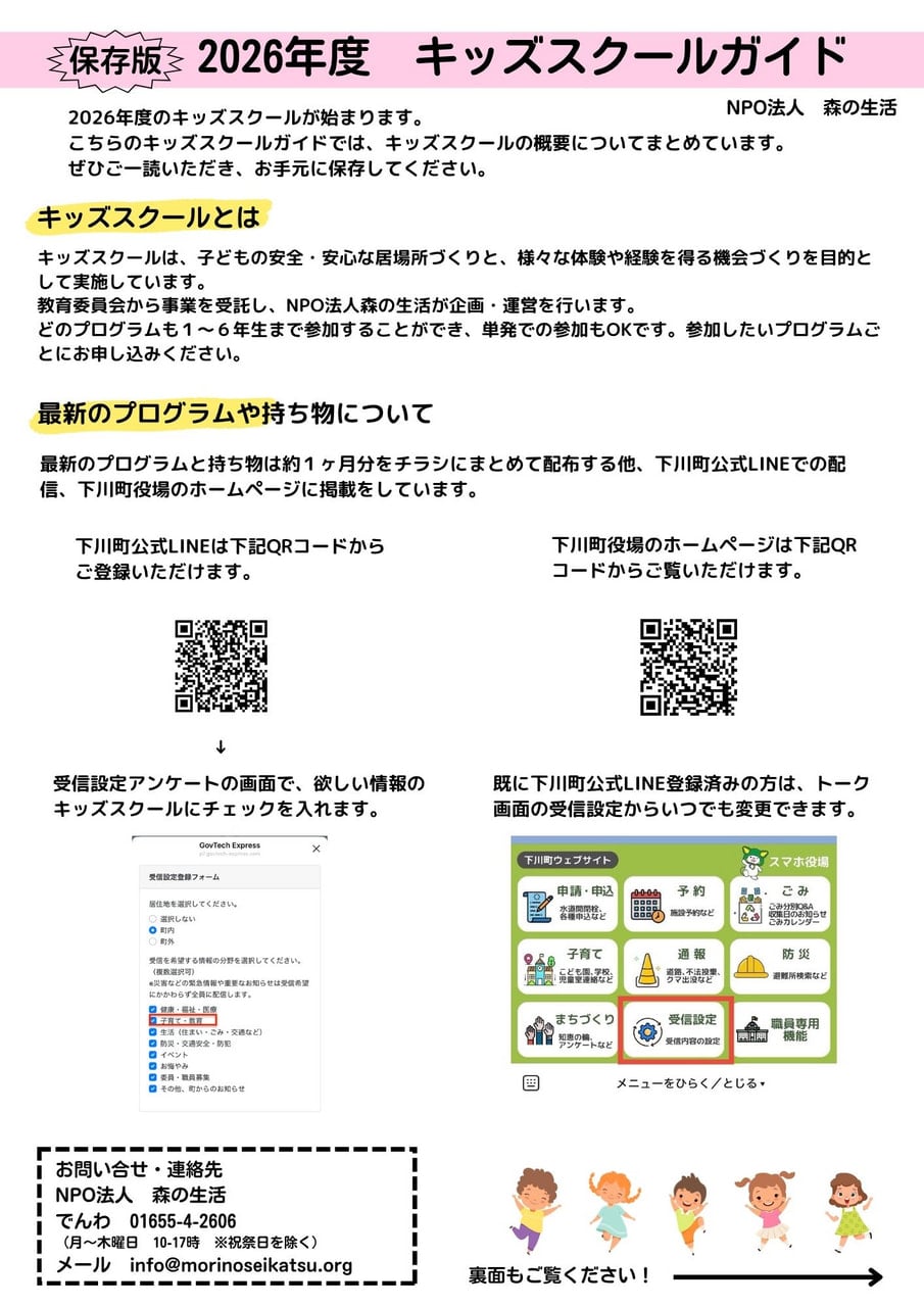現在位置: トップページ 各課のページ 教育委員会 教育課 キッズスクールガイドを掲載いたします。 印刷する キッズスクールガイドを掲載いたします。 作成日:2026年04月22日最終更新日:2026年04月22日 <教育委員会からのお知らせ> 2026年度のキッズスクールが始まります。 こちらのキッズスクールガイドでは、キッズスクールの概要についてまとめています。 ぜひご一読下さい。 このページの作成者・お問い合わせ先 教育委員会電話:01655-4-2511 お問い合わせはこちらから メニュー 各課のページ 各課のページトップ 総務企画課 町民生活課 保健福祉課 産業振興課 農業委員会 教育委員会 教育課 出納室 議会事務局 監査委員事務局 町立下川病院 消防署 特別養護老人ホーム あけぼの園 山びこ学園 下川小学校・下川中学校 下川町議会 行政情報 洪水ハザードマップ リンク集